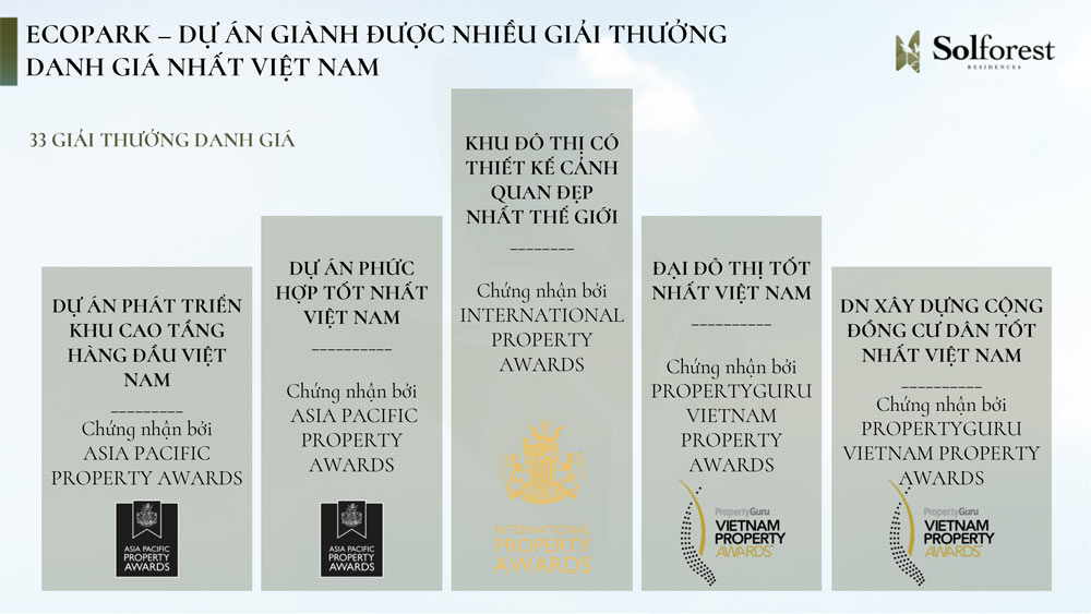 – Năm 2020: Dự án Đáng sống nhất, Top 3 chủ đầu tư bất động sản uy tín nhất Việt Nam năm 2020, Đại đô thị tốt nhất Việt Nam, Nhà phát triển dự án khu phức hợp tốt nhất Việt Nam, Doanh nghiệp phát triển bền vững, Doanh nghiệp thực hiện trách nhiệm ESG tốt nhất, Doanh nghiệp xây dựng cộng đồng cư dân tốt nhất, Khu đô thị tốt nhất Châu Á